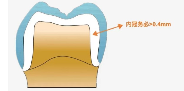 純鈦內(nèi)冠由于本身的強度和密度的問題,低于0.4mm容易發(fā)生蠕變,所以在制作純鈦烤瓷時除了對技工所有要求,同時對臨床備牙也是有要求的,除了預留足夠的空間還建議備有肩臺。