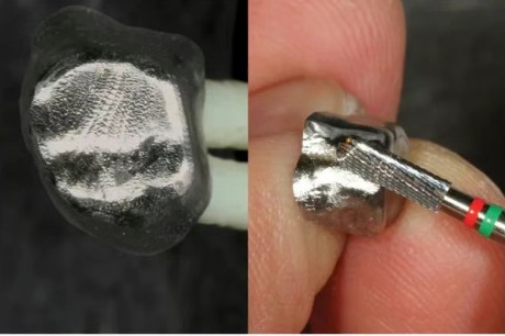 1.制作鈦金屬內(nèi)冠,對鈦冠表面打磨粗糙或雕刻花紋以增強金瓷結(jié)合強度。打磨后的鈦冠表面需處理干凈。